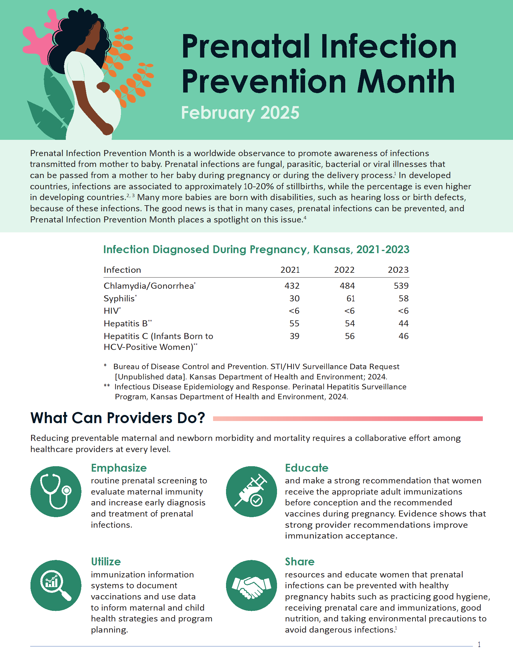 In recognition of February as Prenatal Infection Prevention Month, KDHE has developed the attached Action Alert and social media graphics. Please share this important health information throughout the month with the individuals you serve, your colleagues, collaborative community partners, and on your social media platforms.
